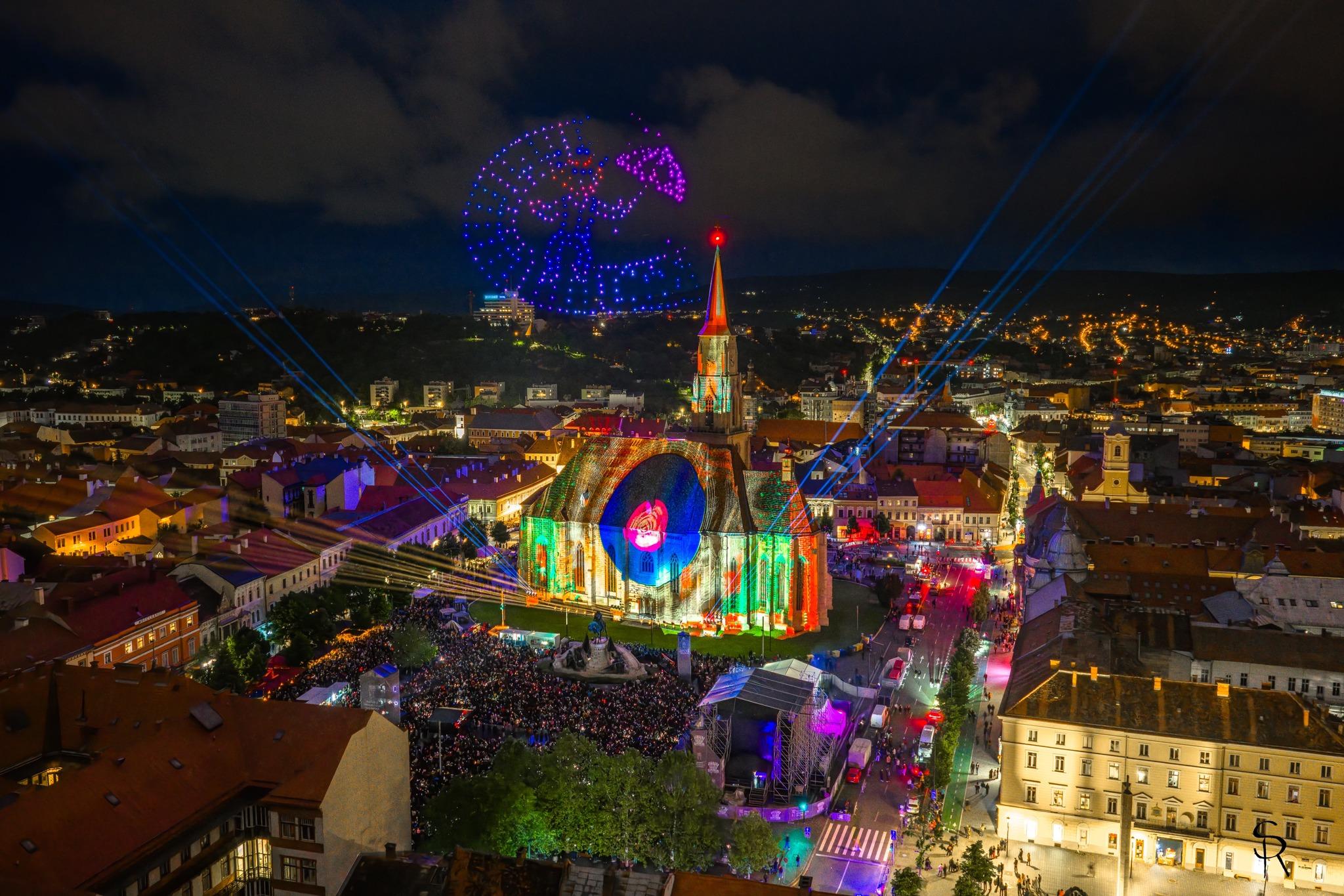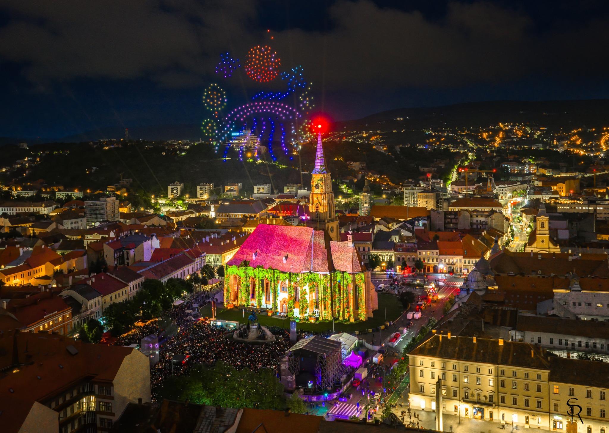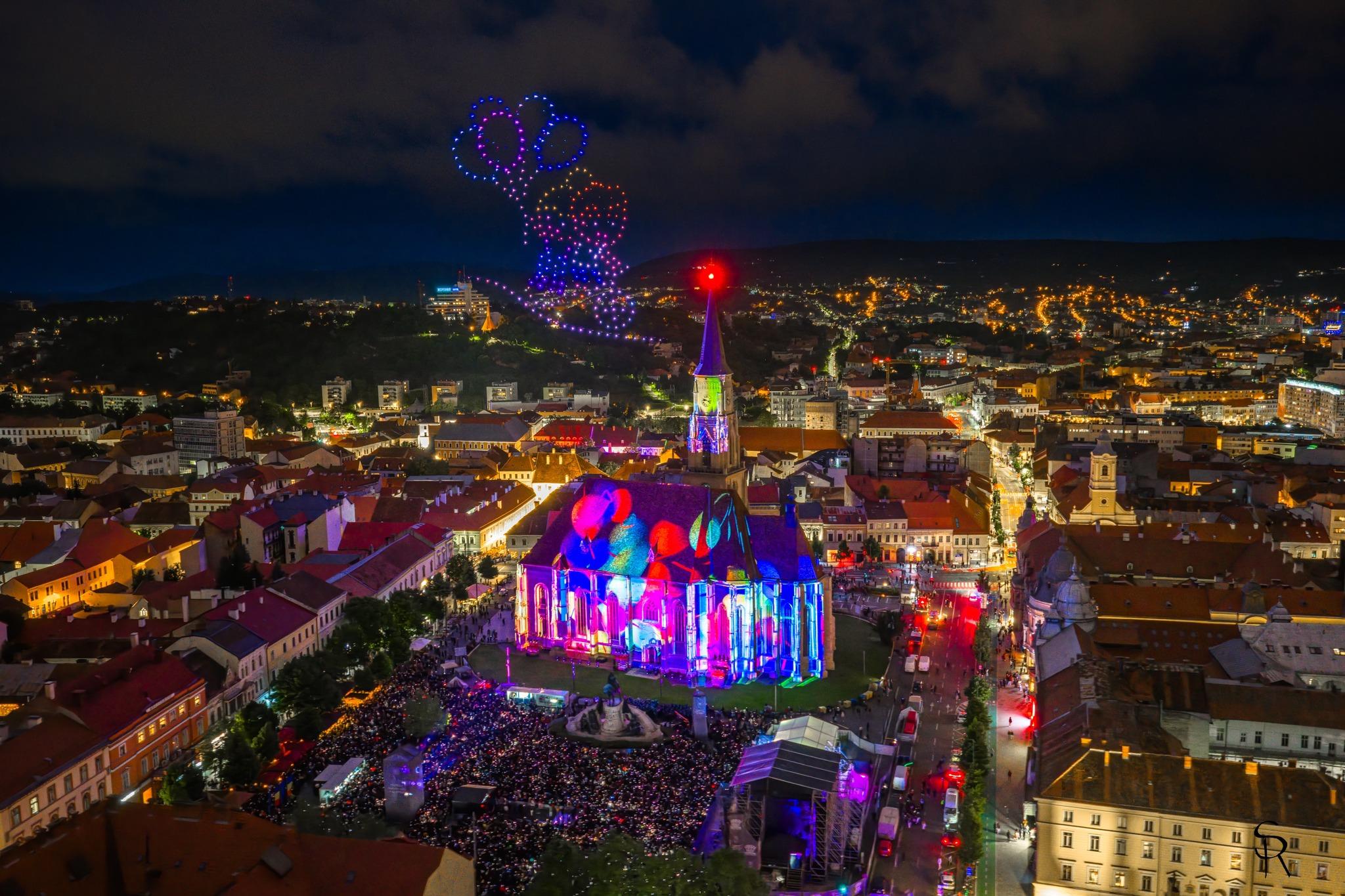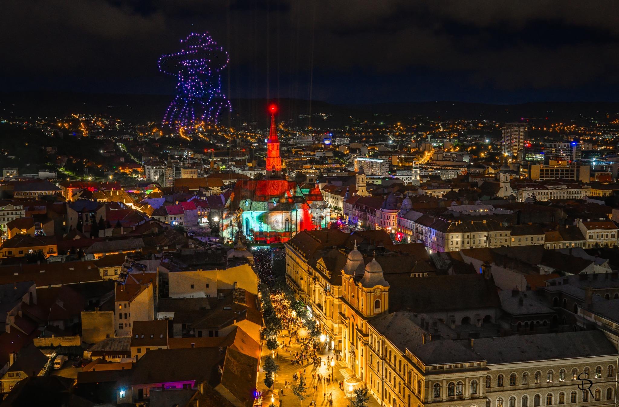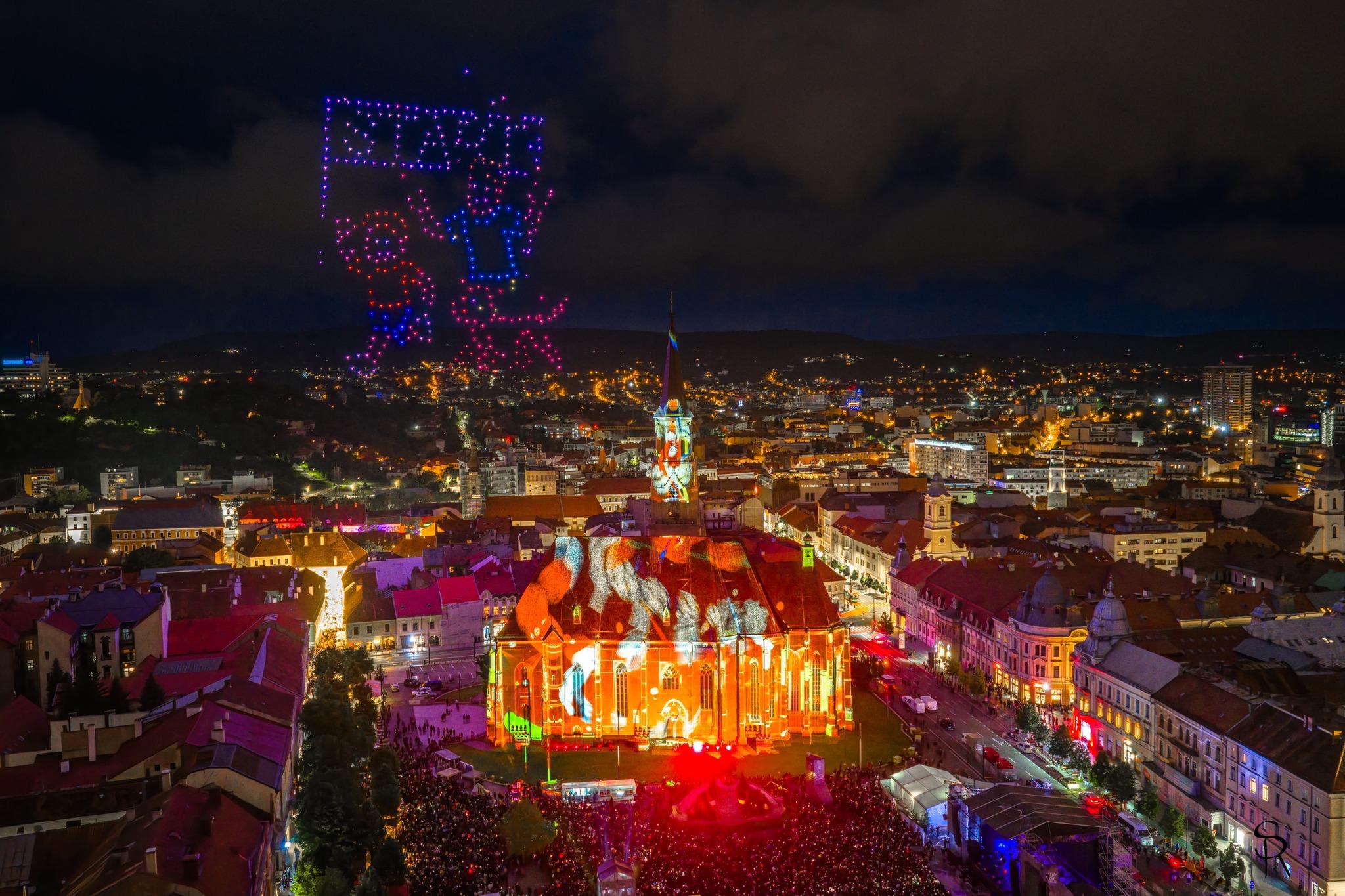 Fotograful Sergiu Răzvan, unul dintre cei mai talentați fotografi ai Clujului, a reușit să surprindă în imagini spectaculoaserealizate din dronă întreaga desfășurare aeriană – de la formele animate create din lumini, până la chipul emblematic al actorului Florin Piersic, care a fost recreat cu ajutorul dronelor. Fotografii de o claritate remarcabilă au surprins atât amploarea tehnică a momentului, cât și emoția publicului.