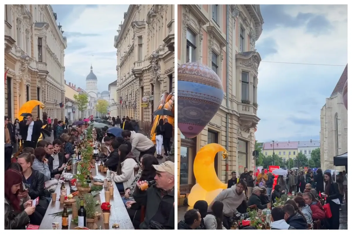 Clujenii sunt o mare familie! Ploaia nu i-a oprit să fie împreună: Încărcați cu „merinde”, s-au adunat aseară la o masă uriașă în centrul orașului VIDEO
