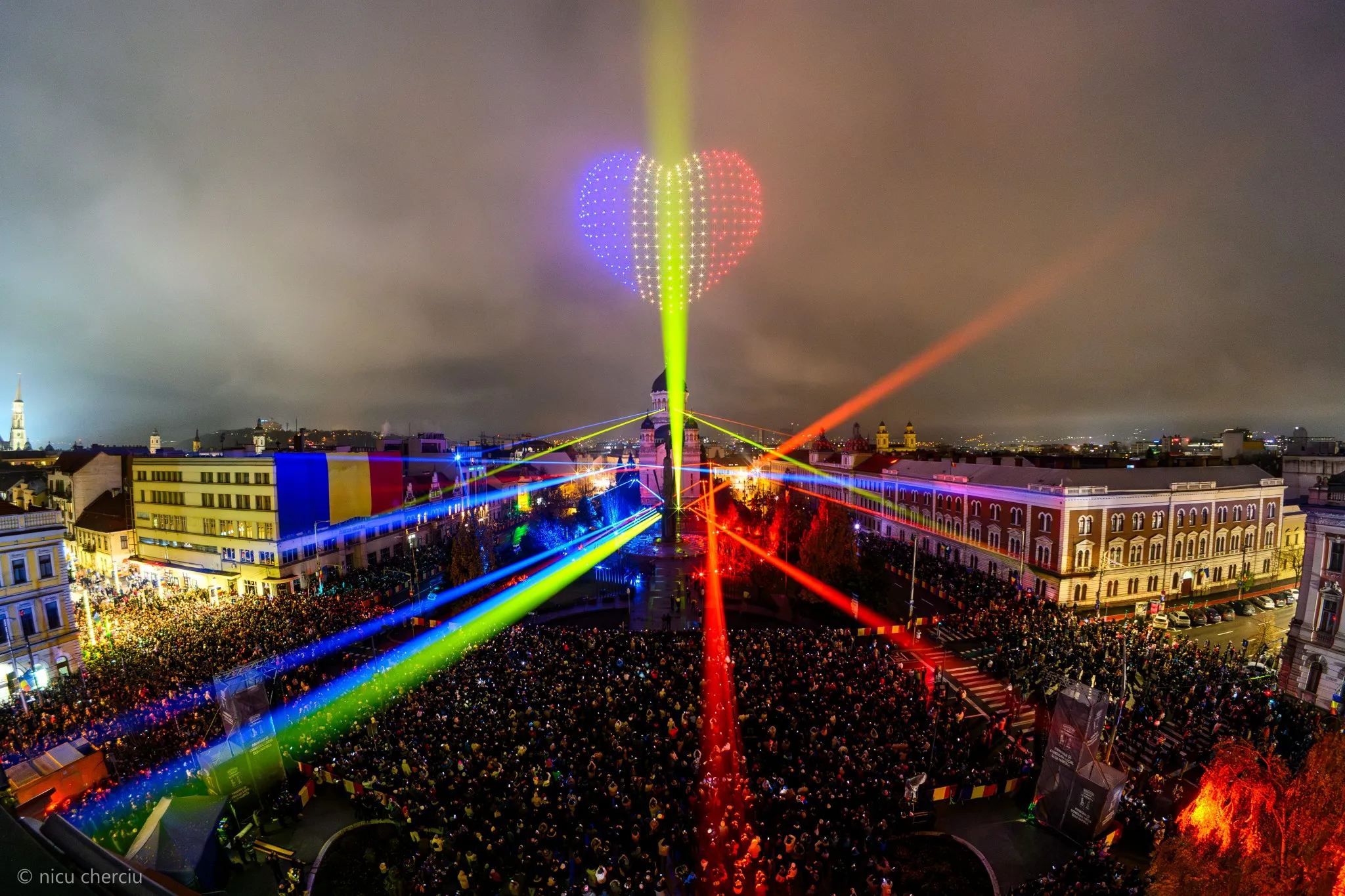 Piața Unirii și întreaga zonă centrală au fost inundate de lumini spectaculoase, iar din cer, dronele au creat un tricolor imens, care a strălucit deasupra mulțimii. Însă, cel mai emoționant moment a fost atunci când, pe fundalul acestor luminile, a apărut o inimă tricoloră, simbol al iubirii și al solidarității naționale.